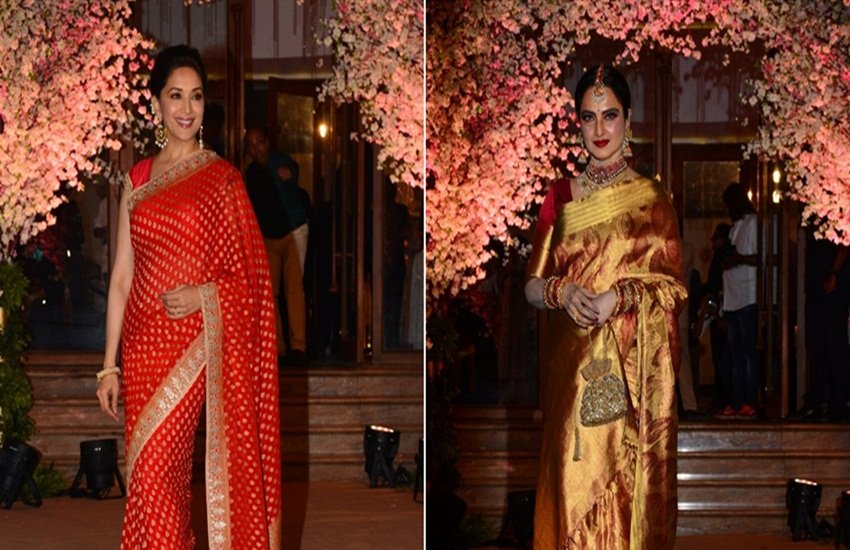 बॉलीवुड के बड़े और नामी सितारों ने हाल ही में एक वेडिंग सेरेमनी में शामिल हुए। यह वेडिंग रिसेप्शन शैना नाथ का था। शैना बॉ़लीवुड सेलिब्रिटी रिक्कू राकेश नाथ की बेटी हैं। इस रिसेप्शन में रेखा, माधुरी दीक्षित नेने, अनिल कपूर, विक्की कौशल, जैकी श्रॉफ, अनुपम खेर, राकेश रोशन सहित कई एक्टर्स दिखे। मुंबई में हुए इस ग्रांड रिसेप्शन में स्टार्स का जमावड़ा देखने को मिला। जहां एक तरफ पुरुष ब्लैक और ब्लू शेड्स की ड्रेस में नजर आए वहीं रेखा और माधुरी ने सभी की अटेंशन को अपनी तरफ खींच लिया। दोनों ने गोल्ड के वर्क वाली लाल रंग की साड़ी पहनी थी। माधुरी ने जहां साड़ी के साथ मोती वाले ईयरिंग्स पहने थे वहीं रेखा ने पारंपरिक सिल्क साड़ी के साथ गोल्ड ज्यूलरी से अपने लुक को पूरा किया था। एक्टर अनिल कपूर, राकेश रोशन और अनुपम खेर को रिसेप्शन पर रियूनियन करने का मौका मिला। तीनों ने साथ में फोटोज भी खिंचवाईं।