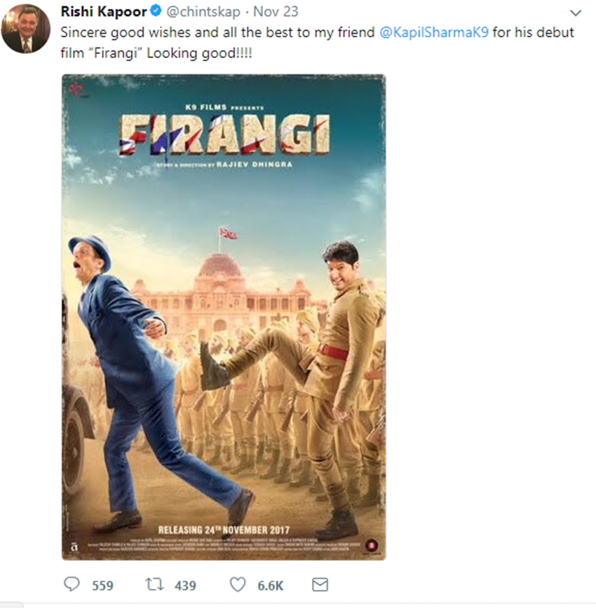 इस पोस्ट में ऋषि कपिल शर्मा को उनकी अप कमिंग फिल्म ‘फिरंगी’ के लिए बधाई देते नजर आ रहे हैं। लेकिन इस बीच ऋषि कपूर कपिल को मुबरकबाद देते-देते बड़ी गलती कर गए। ऋषि कपूर ने कपिल के लिए किए ट्वीट में लिखा, ‘सिंसियर गुड विशिज, आपकी डेब्यू फिल्म के लिए ऑल द बेस्ट मेरे दोस्त। ‘फिरंगी’ बहुत अच्छी लग रही है।’ बता दें, कपिल शर्मा की ‘फिरंगी’ 1 दिसंबर को रिलीज हो रही है।