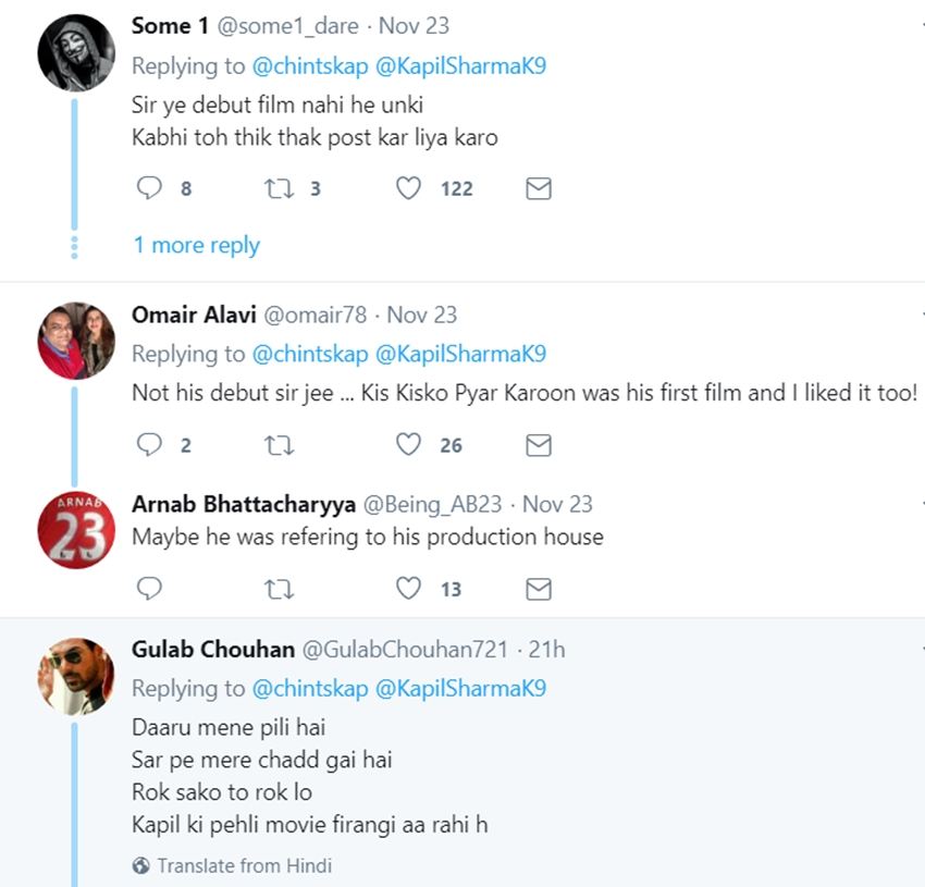 कपिल की ये फिल्म उनकी डेब्यू फिल्म नहीं है। इससे पहले भी कपिल शर्मा बड़े पर्दे पर साल 2015 में आई फिल्म ‘किस किस को प्यार करूं’ में नजर आ चुके हैं। फिलहाल ऋषि कपूर के इस ट्वीट का जवाब कपिल कैसे देंगे इसका सबको बेसब्री से इंतजार है। लेकिन ट्विटर यूजर्स ऋषि कपूर के इस ट्वीट पर चुटकी लेते हुए नजर आ रहे हैं। एक यूजर लिखता है, ‘सर ये डेब्यू फिल्म नहीं है उनकी, कभी तो ठीक ठाक पोस्ट कर लिया करो।’