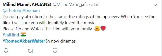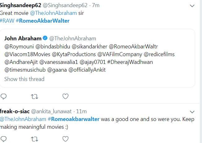 जॉन अब्राहम की RAW को देखने के लिए दर्शक सिनेमाघरों का रुख कर रहे हैं। ट्रेड पंडितों का कहना है कि फिल्म को वीकेंड का भी भरपूर फायदा मिलेगा। एक यूजर ने लिखा- फिल्म को देखने के बाद अभी लौटा। RomeoAkbarWalter को मैंने खूब एन्जॉय किया।