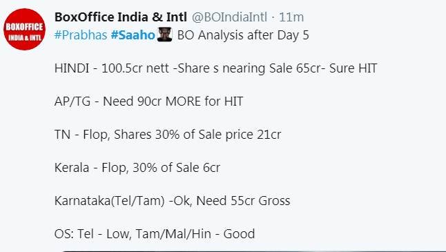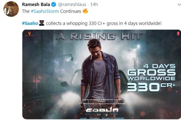 राजा शेखर ने ट्विटर पर साहो की कमाई को ऐतिहासिक ओपनिंग बताया है। राजा ने लिखा- 130 करोड़ नॉर्थ, 110 करोड़ आंध्र प्रदेश, 45 करोड़ कर्नाटक और65 करोड़ ओवरसीज।