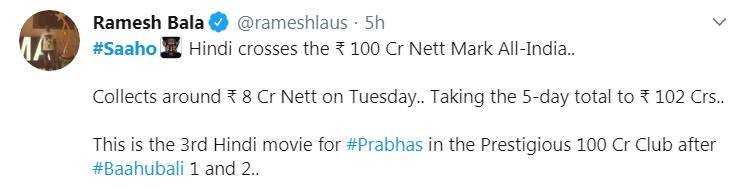 प्रभास ने हिंदी भाषा में पांचवें दिन 8 करोड़ रुपए की कमाई की है। ऐसे में फिल्म का अबतक का कुल कलेक्शन हिंदी भाषा में 102 करोड़ रुपए हो गया है। बाहुबली और बाहुबली 2 के बाद प्रभास की तीसरी फिल्म साहो ने 100 करोड़ के क्लब में एंट्री मारी है।