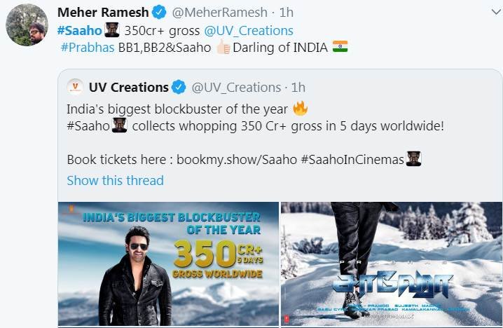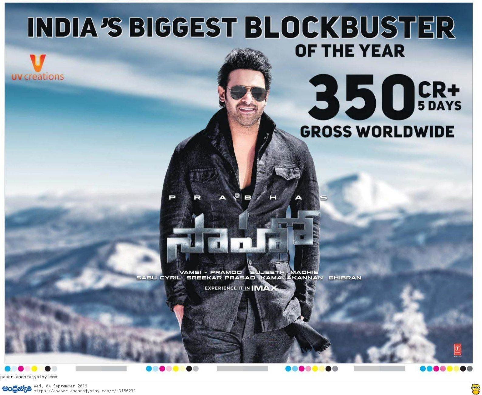 फिल्म के प्रोडक्शन हाउस यूवी क्रिएशन ने साहो के पांचवें दिन की वर्ल्डवाइड कमाई को शेयर किया है। यूवी क्रिएशन के मुताबिक, प्रभास की साहो ने पांच दिनों में 350 करोड़ से ज्यादा की कमाई कर डाली है। इसी के साथ फिल्म पर इस साल की बिगेस्ट ब्लॉकबस्टर का ठप्पा भी लग गया है।