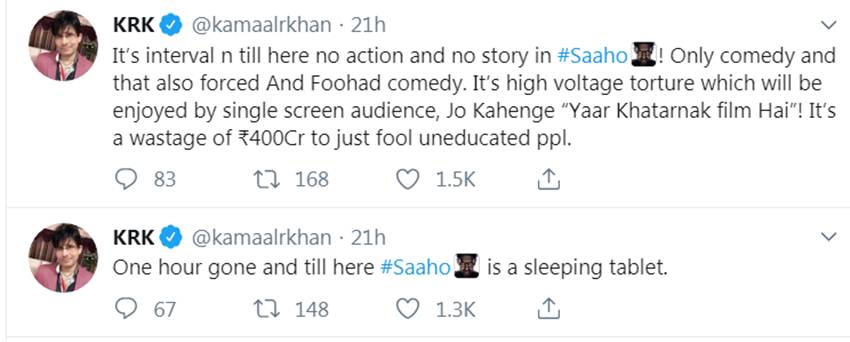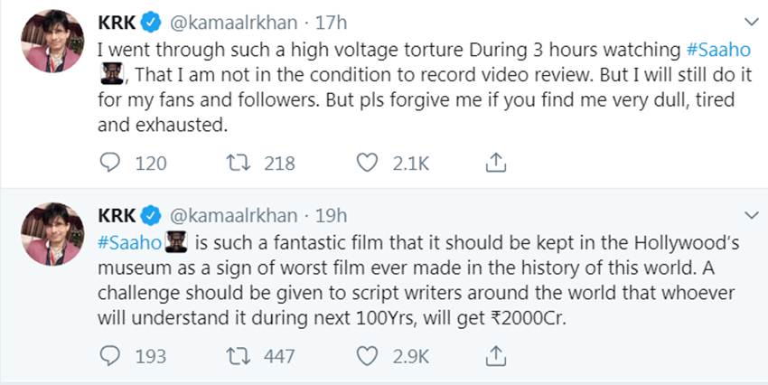 एक्टर ने एक के बाद एक कई ट्वीट कर साहो का रिव्यू दिया। एक अन्य ट्वीट में केआरके ने लिखा- ”मैंने साहो को देखने के दौरान 3 घंटे का हाईवोल्टेज टॉर्चर बर्दाश्त किया। मैं स्थिति में नहीं हूं कि वीडियो रिव्यू रिकॉर्ड कर सकूं। हालांकि मैं अपने फैन्स और फॉलोवर्स के लिए करूंगा।”