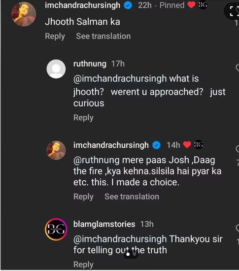 इसका वीडियो काफी समय तक इंटरनेट पर वायरल हुआ था और चंद्रचूड़ ने कमेंट में सलमान को झूठा बताया था। उनका कमेंट था, ‘सलमान का झूठ।’ इसपर यूजर्स ने चंद्रचूड़ से तमाम सवाल किए थे। लोगों ने पूछा था कि क्या ये रोल उन्हें ऑफर नहीं हुआ था? इसपर चंद्रचूड़ ने जवाब देते हुए लिखा था, “मेरे पास जोश, दाग द फायर, क्या कहना, सिलसिला है प्यार का जैसी कई फिल्में थीं। मैंने ऑप्शन चुना।”