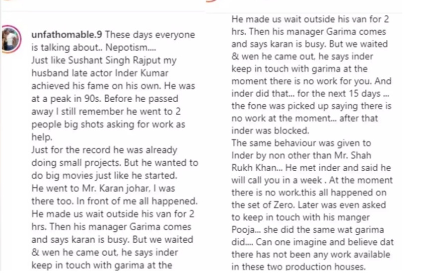 सुशांत सिंह राजपूत के निधन के बाद नेपोटिज्म की बहस काफी तेज हो गई। आए दिन बॉलीवुड से जुड़े कलाकार भाई-भतीजावाद के शिकार होने की आपबीती शेयर कर रहे हैं। इस बीच सलमान खान की फिल्म वांटेड में उनके को-एक्टर रहे दिवंगत अभिनेता इंदर कुमार की पत्नी ने सोशल मीडिया के माध्यम से करण जौहर और शाहरुख खान पर पति की बुरे वक्त में मदद ना करने का आरोप लगाया है।