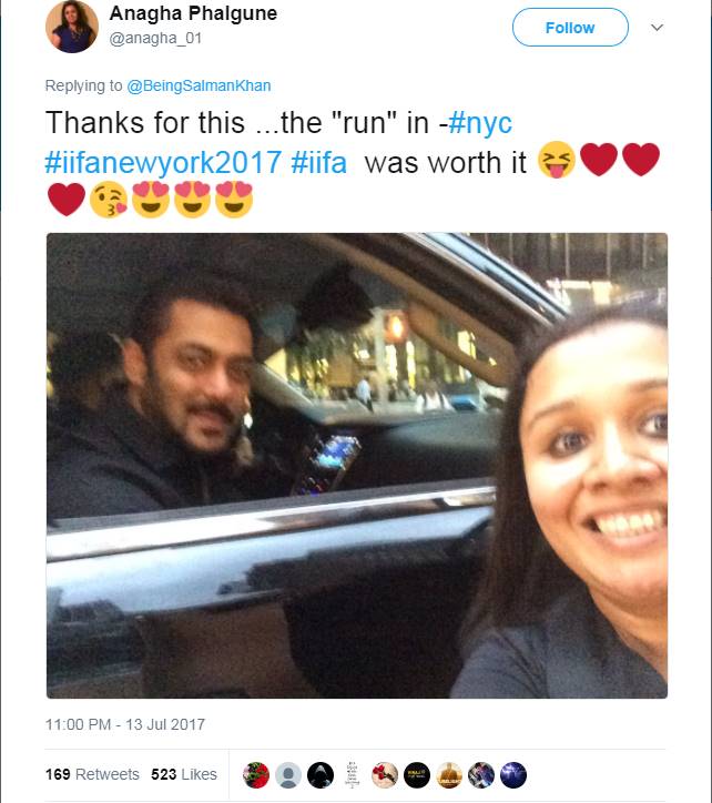बॉलीवुड सुपस्टार सलमान खान नजदीक हों और फैन्स सेल्फी लेने का मौका चूक जाएं ऐसा कैसे हो सकता है? लेकिन IIFA 2017 के दौरान दबंग खान की एक फैन ने उनके साथ ऐसे सेल्फी ली कि यह तस्वीर देखते ही देखते वायरल हो गई। यह फोटो क्लिक की अनघा फाल्गुने नाम की सलमान खान की फैन ने। अघाना ने यह तस्वीर उस वक्त क्लिक की जब सलमान अपनी गाड़ी से निकल रहे थे। अनघा ने बिलकुल सही मोमेंट पर कैमरा का क्लिक बटन दबाया। गुड लक यह भी रहा कि सलमान उस वक्त अघाना के कैमरा की ही तरफ देख रहे थे। अनघा ने इस खूबसूरत तस्वीर को अपने ट्विटर हैंडल से शेयर भी किया है।