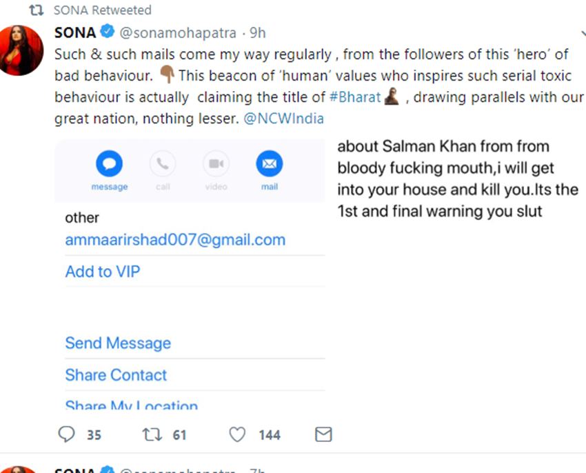 सोना ने जो ट्वीट शेयर किया था उसमें धमकी भरे शब्दों के साथ लिखा हुआ था- ‘अब एक बार और तुमने सलमान खान के खिलाफ बोला तो मैं तुम्हारे घर में घुस कर तुमको मार डालूंगा। मैं तुम्हें पहली और आखिरी वॉर्निंग दे रहा हूं।’