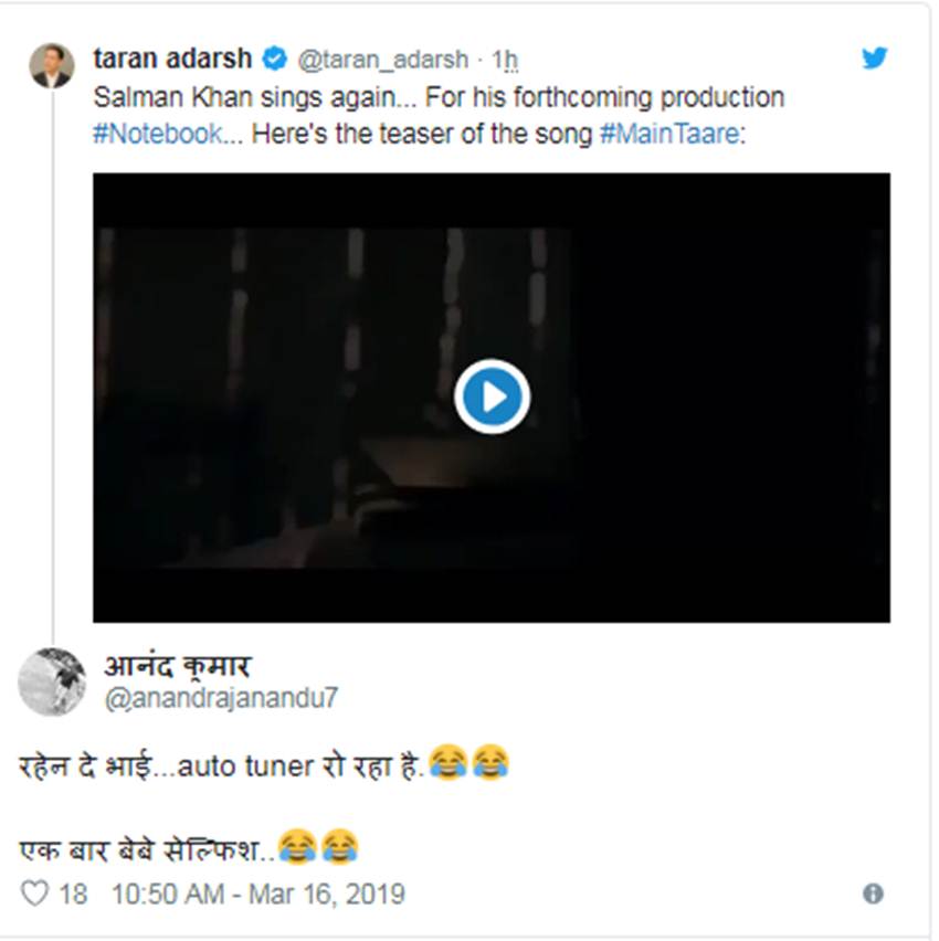 ‘नोटबुक’ के गाने के टीजर को ट्रेड एनालिस्ट तरण आदर्श ने अपने वैरिफाइड ट्विटर अकाउंट से शेयर किया है। टीजर को देखने के बाद लोगों का रिएक्शन देकर लगता है कि सलमान का नया गाना फैन्स को रास नहीं आया है। कुछ ट्विटर यूजर्स का कहना है कि सलमान की आवाज को एडिट किया गया है। वहीं कुछ यूजर्स ने सलमान की आवाज का जमकर मजाक उड़ाया है। एक यूजर ने लिखा- ए तो चुप हो जा रे चुप हो जा। एक यूजर लिखता है- सेल्फिश गाने को यह टक्कर देगा। बता दें कि ‘रेस-3’ के गाने ‘सेल्फिश’ को भी सलमान खान ने गाया था और यह गाना लोगों को पसंद नहीं आया था। एक यूजर ने लिखा- रहने दे भाई..ऑटो ट्यूनर रो रहा है। एक बार बेबे सेल्फिश।