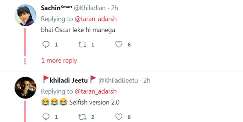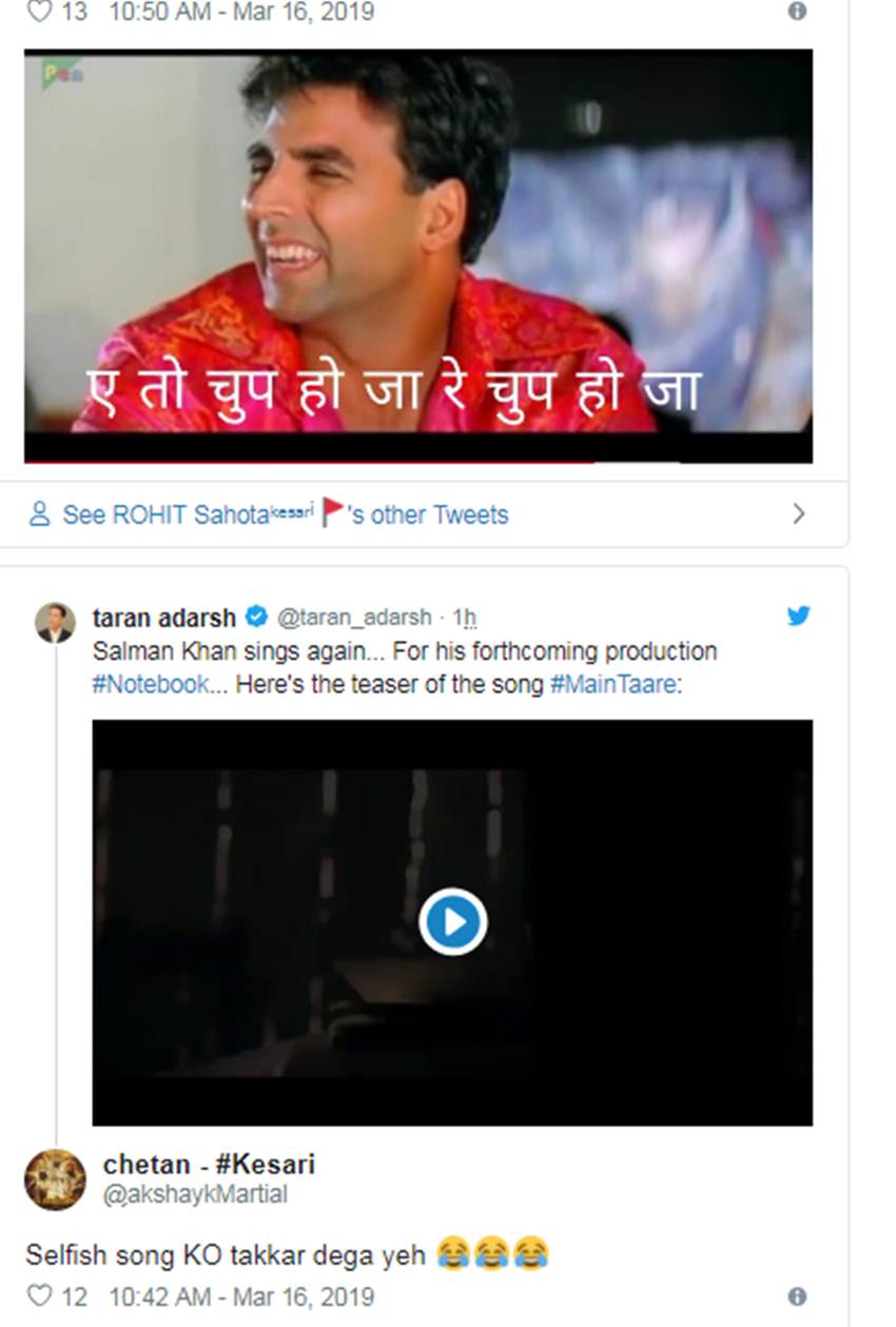 ‘नोटबुक’ के गाने के टीजर को ट्रेड एनालिस्ट तरण आदर्श ने अपने वैरिफाइड ट्विटर अकाउंट से शेयर किया है। टीजर को देखने के बाद लोगों का रिएक्शन देकर लगता है कि सलमान का नया गाना फैन्स को रास नहीं आया है। कुछ ट्विटर यूजर्स का कहना है कि सलमान की आवाज को एडिट किया गया है। वहीं कुछ यूजर्स ने सलमान की आवाज का जमकर मजाक उड़ाया है। एक यूजर ने लिखा- ए तो चुप हो जा रे चुप हो जा। एक यूजर लिखता है- सेल्फिश गाने को यह टक्कर देगा। बता दें कि ‘रेस-3’ के गाने ‘सेल्फिश’ को भी सलमान खान ने गाया था और यह गाना लोगों को पसंद नहीं आया था। एक यूजर ने लिखा- रहने दे भाई..ऑटो ट्यूनर रो रहा है। एक बार बेबे सेल्फिश।