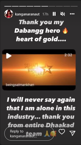 कंगना ने कहा-थैंक्यू मेरे दबंग हीरो: सलमान खान की पोस्ट के स्ट्रीनशॉट को कंगना ने अपने इंस्टाग्राम पर पोस्ट करते हुए लिखा,”थैंक्यू मेरे दबंग हीरो, जिनका दिल सोने जैसा है। मैं अब कभी नहीं कहूंगी कि मैं इस इंडस्ट्री में अकेली हूं। पूरी धाकड़ टीम की तरफ से आपका शुक्रिया।”