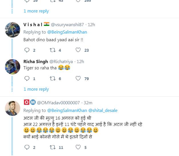 सलमान ने अपने वैरिफाइड ट्विटर हैंडल से लिखा- ‘अटल जी के जैसा एक महान राजनेता और अच्छे इंसान को खो देना बेहद दुखद है।’ जिसका जवाब देते हुए एक यूजर ने लिखा- बहुत दिनों के बाद याद आई भाई। वहीं एक अन्य यूजर ने लिखा- भाई कौन सा न्यूजपेपर आता है। एक अन्य ट्विटर यूजर लिखता है- टाइगर सो रहा था। एक यूजर लिखता है- अटल जी का निधन 16 अगस्त को हुआ था और आज 22 अगस्त है। इन्हें 11 घंटे पहले याद आई है कि अटल जी नहीं रहे। क्यों भाई कौन से गोले में थे इतने दिनों से।