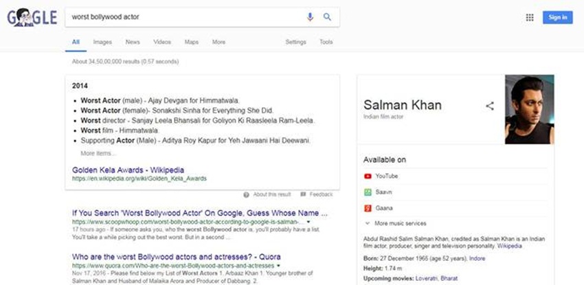 शायद ही किसी को इस बात में शक हो कि सलमान खान बॉलीवुड के सुपरस्टार हैं। सलमान खान का जलवा इतना है कि उनकी लगभग हर फिल्म सौ करोड़ के क्लब में शामिल हो रही है। बॉलीवुड में आजकल सफलता का पैमाना है फिल्मों का 100 करोड़ क्लब में शामिल होना। इस मामले में अगर कोई ऐक्टर सबसे आगे है तो वह सलमान खान ही हैं। सलमान अब तक 10 से ज्यादा ऐसी फिल्में दे चुके हैं जिसने 100 करोड़ से ज्यादा की कमाई की है। हाल ही में रिलीज हुई उनकी ‘रेस 3’ भी बॉक्स ऑफिस पर खूब धमाल मचा रही है। लेकिन गूगल के मुताबिक सलमान सबसे खराब भारतीय एक्टर हैं। दरअसल अगर आप गूगल पर Worst Indian Actor या Worst Bollywood Actor लिख कर सर्च करेंगे तो गूगल का जवाब सलमान खान होगा। बॉक्स ऑफिस के दबंग सलमान खान को उनके स्टारडम के बावजूद गूगल उनको सबसे खराब ऐक्टर के मामले में पहले नंबर पर दिखा रहा है।