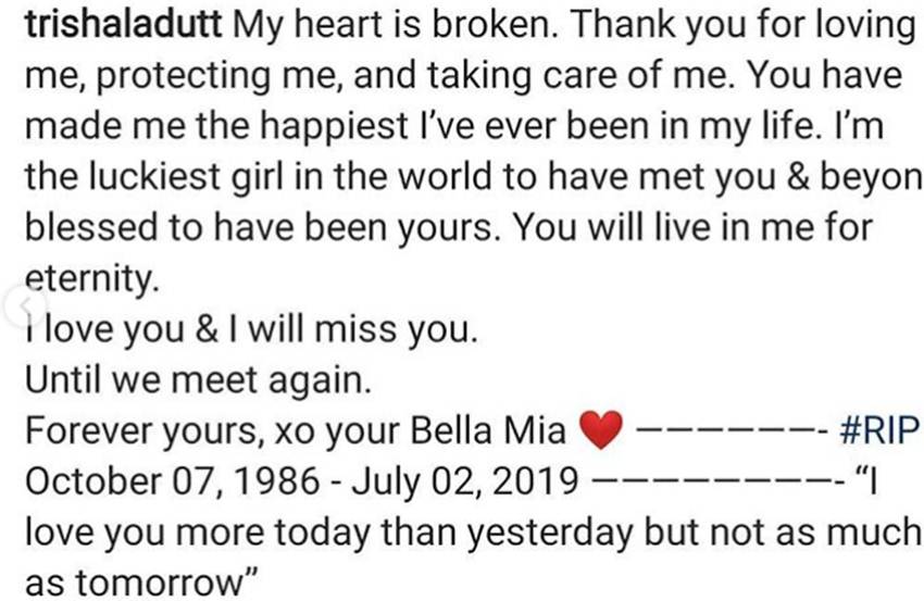 त्रिशाला ने पोस्ट में बताया है कि उनके बॉयफ्रेंड का निधन 2 जुलाई 2019 को हुआ था। हालांकि त्रिशाला ने अपने बॉयफ्रेंड का नाम जगजाहिर नहीं किया है। लेकिन सोशल मीडिया पर वह अक्सर बॉयफ्रेंड के साथ तस्वीरें शेयर करती रहती थीं। त्रिशाला ने पहले अपने इंस्टाग्राम हैंडल को सार्वजनिक किया हुआ था। लेकिन अब उन्होंने अपने अकाउंट को प्राइवेट कर लिया है।