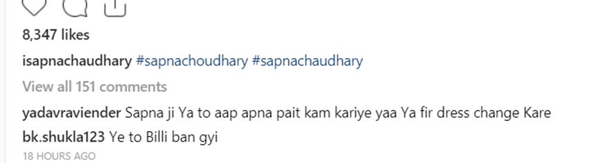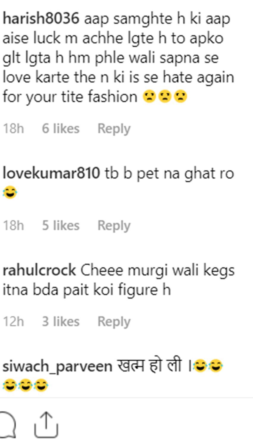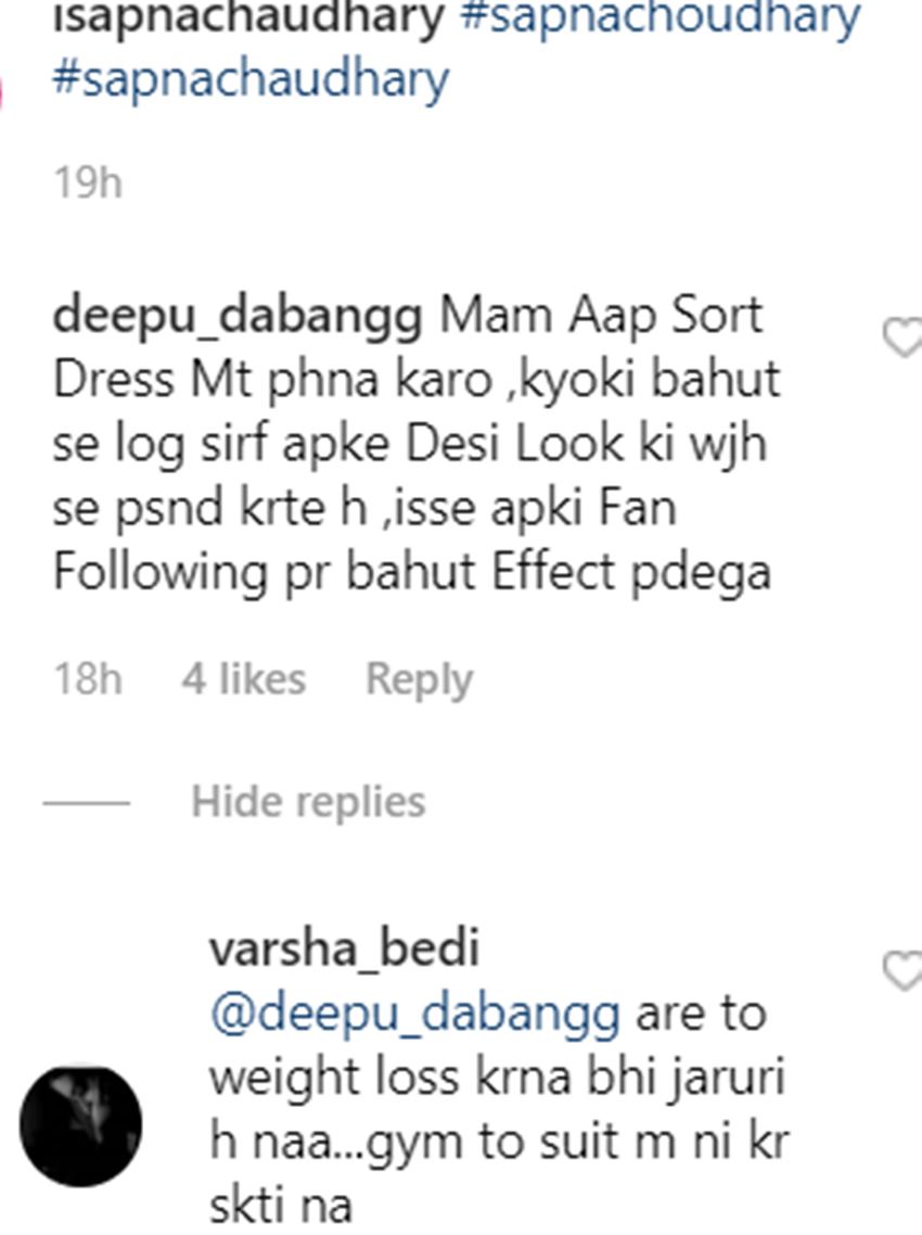 इसके लिए भी सपना को काफी ट्रोल किया गया था उन्हें कहा गया था कि सपना छोटे कपड़े न पहना करें। ऐसे ही इस तस्वीर पर भी कमेंट्स आने लगे। सपना के एक फैन ने कहा-‘आप शॉर्ट ड्रेस मत पहना करो, क्योंकि बहुत से लोग आपको देसी लुक की वजह से प्यार करते हैं।’ देखें कमेंट्स:-