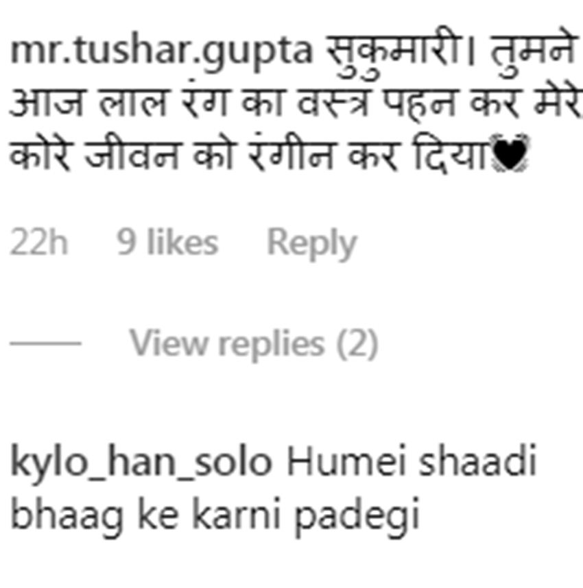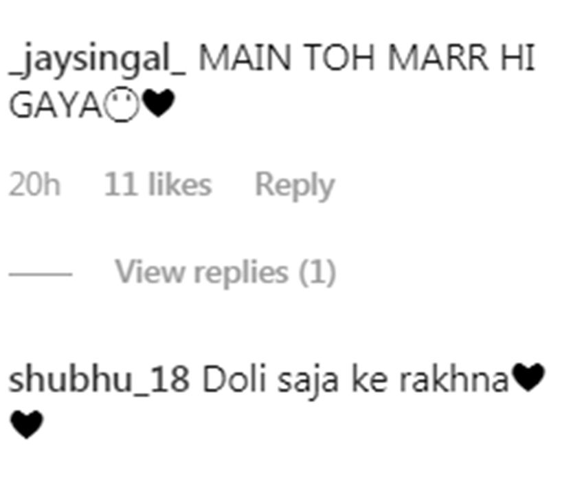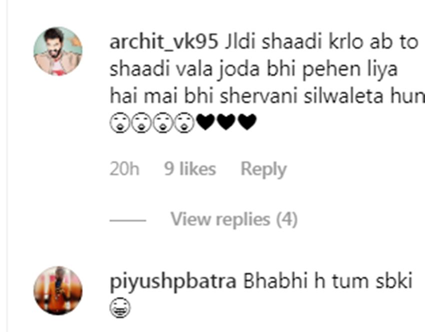 एक इंस्टा यूजर ने लिखा- जल्दी शादी कर लो अब तो शादी करने वाला जोड़ा भी पहन लिया है, मैं भी शेरवानी सिलवाता हूं। वहीं एक सोशल मीडिया यूजर ने लिखा- भाभी है तुम सब की। एक यूजर लिखता है- लाल दुपट्टे वाली अपना नाम तो बता? वहीं एक यूजर लिखता है- कोई भी नब्ज चेक करो, लग रहा है कि तुम्हारी भाभी ने अपनी खूबसूरती से मेरा कत्ल करने की कोशिश की है।