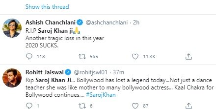 रोहित जैसवाल और आशीष चंचलानी ने भी सरोज खान के निधन पर शोक प्रकट किया