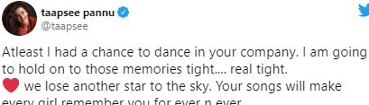 सरोज खान के निधन पर बोलीं तापसी पन्नू: कम से कम मुझे आपके साथ काम करने का मौका तो मिला। मैं हमेशा इन यादों को अपने साथ रखूंगी।