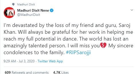 माधुरी दीक्षित ने लिखा- 'मैं टूट गई हूं, सरोज की के यूं चले जाने से..। वह मेरी दोस्त भी थीं वह मेरी गुरू भी थीं। मैं हमेशा उनके काम के लिए उनकी ग्रेटफुल रहूंगी। उन्होंने मुझे और मेरे डांस में बहुत मदद की। मुझे मेरी पोटांशियल तक पहुंचने में मदद की। दुनिया ने एक बहुत ही नायाब टैलेंट खो दिया है। सरोज जी आपको हमेशा मिस करूंगी।