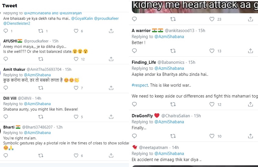 दरअसल एक यूजर के ट्वीट पर शबाना आजमी ने जवाब दिया था- यूजर ने ट्वीट किया था- 5 बजे शाम रविवार को हर किसी को बाहर आने औऱ उन लोगों को शुक्रिया कहने की जरूरत है जो हमारे लिए काम कर रहे हैं, जो हमारे लिए तालियां बजा रहे हैं औऱ प्लेटें बजा रहे हैं।क्या नॉनसेंस है ये?’ इस पर शबाना आजमी ने जवाब देना जरूरी समझा।
