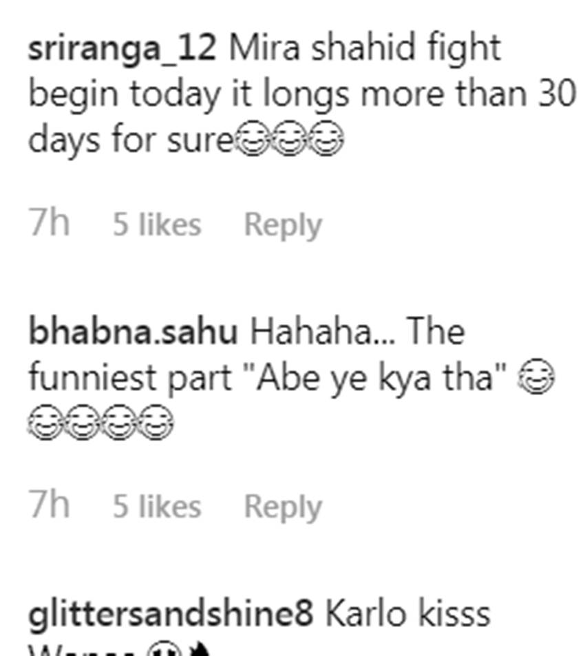 वीडियो के सोशल मीडिया पर सामने के बाद लोग इसे बार-बार देख रहे हैं। कुछ ही घंटों के भीतर वीडियो को 2 लाख से भी ज्यादा व्यूज मिल गए हैं। एक यूजर ने कमेंट बॉक्स में लिखा- दोनों के बीच कुछ न कुछ पक रहा है, मीरा (शाहिद की पत्नी) को इनपर पैनी नजर रखनी चाहिए। वहीं एक अन्य यूजर ने लिखा- दरवाजे के बंद होने पर जो आवाज आती है- अरे ये क्या था कमाल है। वहीं एक अन्य सोशल मीडिया यूजर लिखता है- दोनों बहुत चलाक हैं, जो मीडिया चाहती है ये वहीं दिखा रहे हैं मीडिया से तेज। एक यूजर ने लिखा- मीरा और शाहिद की लड़ाई होने वाली है और यह बेशक 30 दिनों तक चलेगी।