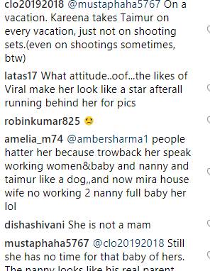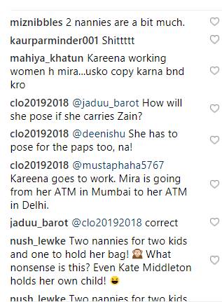 सोशल मीडिया यूजर्स ने मीरा की इस वीडियो पर कमेंट करते हुए लिखना शुरू कर दिया कि दो नैनीज बहुत ज्यादा होती हैं। तो कुछ लोगों ने करीना से मीरा की तुलना करते हुए कहा कि करीना वर्किंग है ऐसे में मीरा उन्हें कॉपी करना बंद करें। यहां देखें यूजर्स के कमेंट्स:-