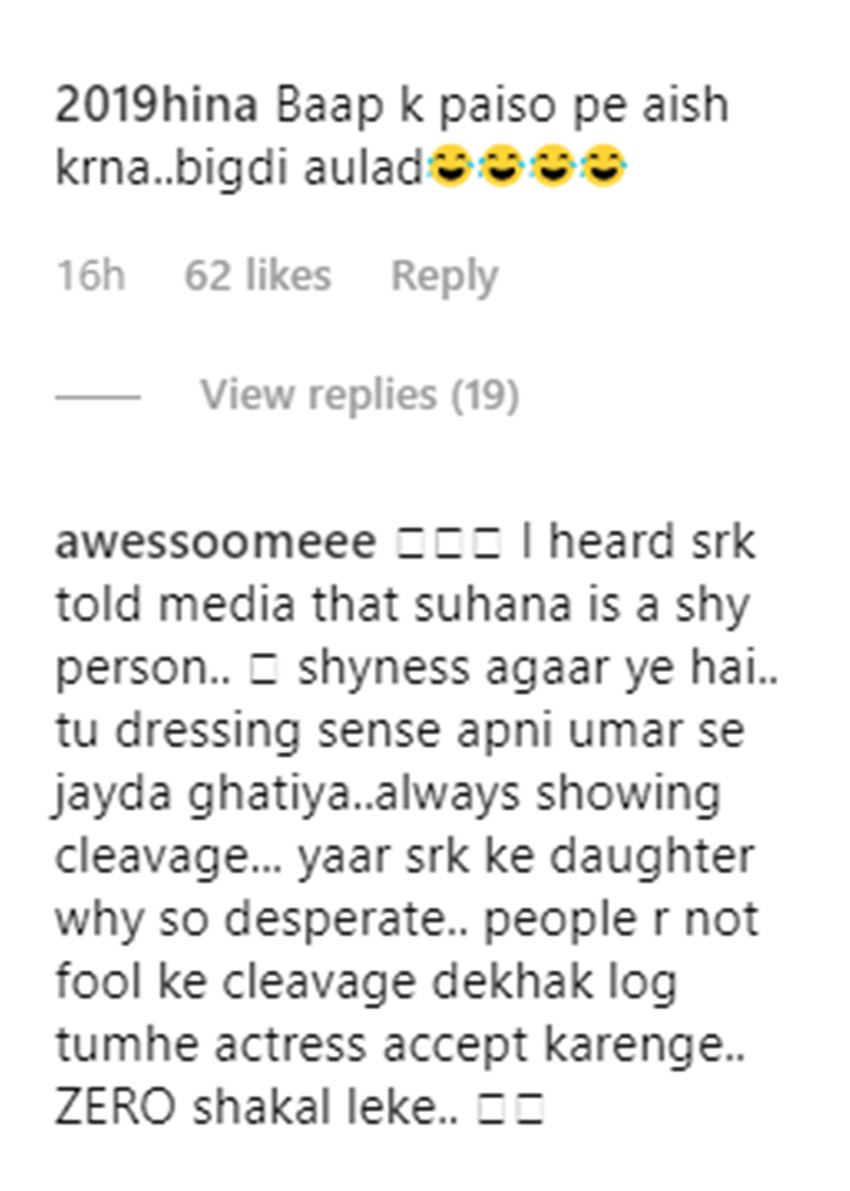 सुहाना को ऐसे डांस करते देख एक सोशल मीडिया यूजर ने लिखा- ‘अपने बाप के पैसे पर ऐश करना, बिगड़ी औलाद।’ तो किसी ने लिखा- मैंने सुना था कि शाहरुख ने एक बार मीडिया में कहा था कि सुहाना बहुत ही शर्मीली हैं। ये शर्म हया है! शाहरुख खान की बेटी है, मत समझना की ऐसे देख कर तुम्हें एक्ट्रेस मान लिया जाएगा।’