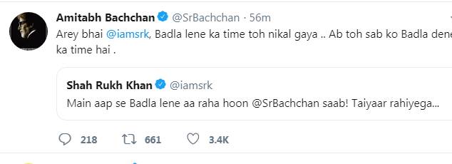 शाहरुख खान ने ट्वीट अमिताभ बच्चन को टैग करते हुए लिखा- ‘मैं आप से बदला लेने आ रहा हूं। अमिताभ बच्चन साहब, तैयार रहिएगा।’ जिसके कुछ समय बाद ही बिग बी ने शाहरुख खान को जवाब में लिखा- ‘अरे भाई शाहरुख खान, बदला लेने का समय तो निकल गया। अब तो सबको बदला देने का टाइम है।’