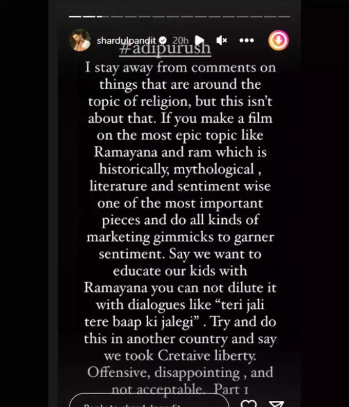 शार्दुल पंडित ने अपनी इंस्टाग्राम स्टोरी पर लिखा कि ‘धर्म से जुड़ी चीजों पर मैं कभी कमेंट नहीं करता हूं लेकिन ये उसके बारे में नहीं है। अगर आप रामायण जैसे किसी एपिक टॉपिक पर फिल्म बना रहे हो और राम जो कि एतिहासिक, पौराणिक, लिट्रेचर और सेंटिमेंट्स के लिहाज से बहुत जरूरी हिस्सा है और उनको प्रमोट करने के लिए आप कोई भी हथकंडा अपनाए। देखिए हम भी अपने बच्चों को रामायण दिखाकर उन्हें शिक्षित करना चाहते हैं। लेकिन आप उसे उन डायलॉग्स से नष्ट नहीं कर सकते। जैसे कि तेरी जली तेरे बाप की जलेगी। मुझे नहीं पता कि आपने कितने करोड़ इस फिल्म में खर्च किए हैं। कितने स्टार्स इस फिल्म को मिले हैं। कितनी कमाई आपने कर ली है। लेकिन थोड़ा रिसर्च करिए। थोड़ा होमवर्क करिए। थोड़ी लेकिन इज्जत दिखाइए जब आप इस तरह से टॉपिक से डील करते हैं।’