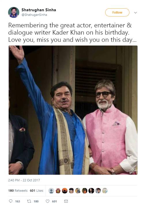 बॉलीवुड एक्टर शत्रुघ्न सिन्हा ने पूर्व अभिनेता कादर खान के जन्मदिन पर उन्हें याद किया। शत्रुघ्न ने अपने ट्विटर हैंडल से अमिताभ बच्चन के साथ एक तस्वीर पोस्ट की और संदेश में लिखा- महान अभिनेता, मनोरंजक और डायलॉग लेखक कादर खान को उनके जन्मदिन पर याद कर रहा हूं। लव यू, मिस यू और विश यू ऑन दिस डे। असल में शत्रुघ्न और अमिताभ ने साथ में कादर खान के साथ काम किया है और इसलिए उन्होंने कादर खान की बजाए अमिताभ बच्चन की तस्वीर पोस्ट कर दी। हालांकि यह मामूली की गलती करना शत्रुघ्न सिन्हा को भारी पड़ गया और लोगों ने उन्हें बेहिसाब ढंग से ट्रोल करना शुरू कर दिया।