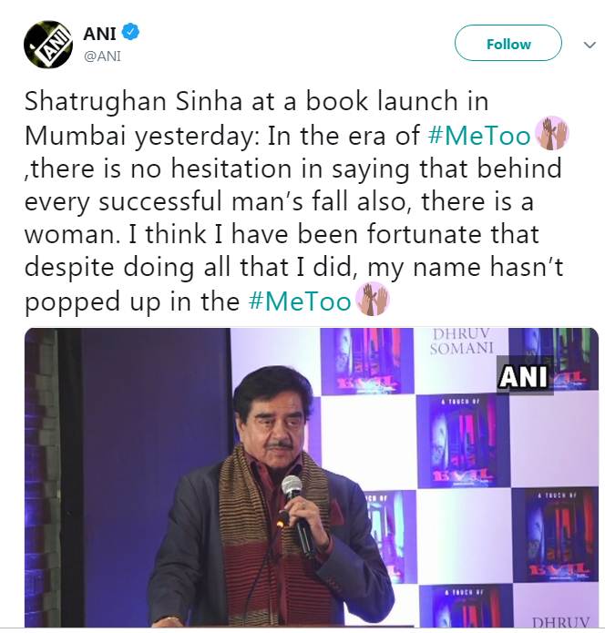 बॉलीवुड के मशहूर अभिनेता और बीजेपी सांसद शत्रुघ्न सिन्हा अक्सर अपने बयानों और कमेंट्स को लेकर चर्चा में रहते हैं। एक बार फिर से शत्रुघ्न सिन्हा ने #MeToo कैपेंन को लेकर ऐसा बयान दिया है जो देखते ही देखते सोशल मीडिया पर वायरल हो गया। शत्रुघ्न सिन्हा के बयान पर लोग उन्हें सोशल मीडिया पर जमकर ट्रोल कर रहे हैं। एक्टर के बयान को सुनने के बाद लोग उन्हें ‘खामोश’ रहने की सलाह दे रहे हैं। दरअसल शत्रुघ्न सिन्हा मंगलवार को मुंबई में एक बुक लॉन्च इवेंट में पहुंचे थे। इस दौरान शत्रुघ्न सिन्हा ने #MeToo कैपेंन को लेकर चौंकाने वाला बयान दिया। एक्टर ने कहा, ”#MeToo के दौर में यह कहने में संकोच नहीं होगा कि हर सफल आदमी को बर्बाद करने में एक महिला का हाथ रहा है। मैं अपने आप को भाग्यशाली समझता हूं कि इतना कुछ करने के वाबजूद इसमें मेरा नाम नहीं आया।” शत्रुघ्न के बयान पर लोग नाराजगी जाहिर कर उनकी लताड़ लगा रहे हैं।