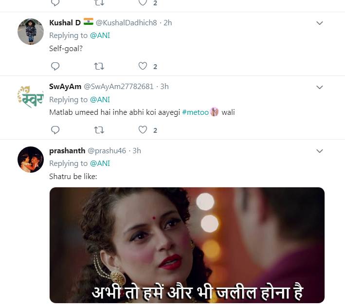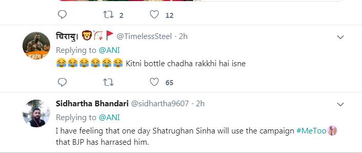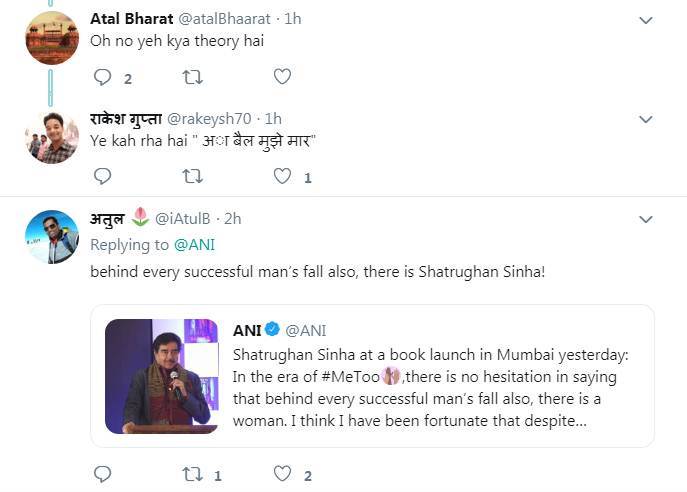 एक यूजर ने लिखा- तुम्हारे टाइम की हिरोइन तो परलोक चली गई हैं, आरोप आएगा कहां से। वहीं एक अन्य यूजर लिखता है- ”भाई इसकी सीबीआई जांच होनी चाहिए।’ यूजर ने लिखा- ”भाई हमें भी आपकी स्टोरी पता है, लेकिन हमसे इज्जत उछाली नहीं जाती।” एक यूजर ने लिखा- ”मुझे लगता है कि एक दिन शत्रुघ्न सिन्हा इस कैपेंन का इस्तेमाल करते हुए कहेंगे कि बीजेपी ने उनका शोषण किया है।” बता दें कि #MeToo कैपेंन के तहत बीते साल कई अभिनेत्रियों ने अपने साथ हुई शोषण की दास्तां को बयां किया था।