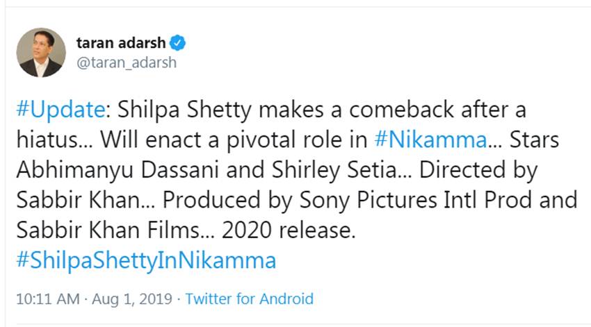 सब्बीर खान की एक्शन और ड्रामा भरपूर फिल्म में शिल्पा शेट्टी अहम रोल अदा करते हुए नजर आएंगी। खबरों की मानें तो निकम्मा में शिल्पा जबरदस्त स्टंट करते हुए नजर आएंगी। फिल्म साल 2020 में सिनेमाघरों में रिलीज होगी। फिल्म को सोनी पिक्चर्स और सब्बीर खान ने मिलकर बनाया है। फिल्म को लेकर शिल्पा ने अपने इंस्टाग्राम पर लिखा- ”हां, यह सच है कि मैं 13 साल के बाद वापसी कर रही हूं। मैंने अपनी अगली फिल्म के लिए उत्साहित हूं।” फिल्म के बारे में बात करते हुए शिल्पा ने कहा, ”मुझे अपना रोल बेहद पसंद आया। इसके पहले मैंने इस तरह का रोल नहीं किया था। मैं दर्शकों को अपना नया अवतार दिखाने के लिए उत्साहित हूं।”