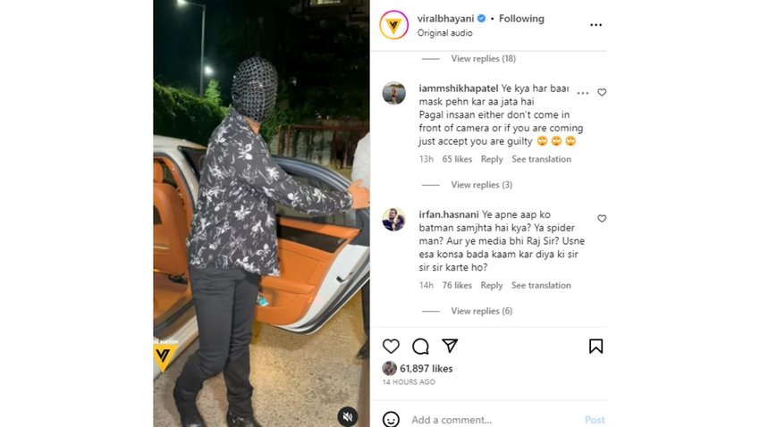 वहीं, अगर राज कुंद्रा के मास्क को लेकर लोगों के रिएक्शन्स की बात की जाए तो इस पर मजेदार कमेंट्स देखने के लिए मिल रहे हैं। एक ने लिखा, ‘ये क्या हर बार मास्क पहनकर आ जते हैं। पागल इंसान। अगर आप कैमरे के सामने नहीं आ रहे हो इसका मतलब है कि आप शर्मिंदगी महसूस कर रहे हैं।’ दूसरे ने लिखा, ‘ये खुद को बैटमैन समझता है क्या? या स्पाइडर मैन। उसने ऐसा कौन सा काम कर दिया है, जो सर सर करते हो सब।’ तीसरे ने लिखा, ‘शिल्पा मैम को कितना शर्मिंदा होना पड़ता होगा यार।’ इसके साथ ही एक ने लिखा, ‘मुंह छुपाने से काली करतूतें नही छुपने वाली।’ इसी तरह से लोग उनकी पोस्ट पर खूब कमेंट्स कर रहे हैं।