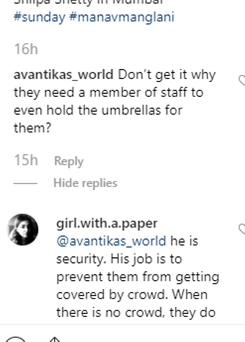 एक यूजर कहता- मुझे समझ नहीं आ रहा कि इन्हें स्टाफ मेंबर्स की क्या जरूरत होती है। छतरी पकड़ने के लिए भी।’ तो एक यूजर चुटकी लेते हुए कहता- ‘वह सिक्योरिटी है। उसका काम है कि वह एक्ट्रेस को भीड़ से प्रोटेक्ट करे। लेकिन जब भीड़ न हो तो वह ये काम करते हैं।’ तो कोई कहता कि अरे इस मौसम में इन्हें कभी भी डेंगू और मलेरिया क्यों नहीं होता। ऐसे में शिल्पा के फैंस उनके सपोर्ट में कहते हैं- किसी के लिए अच्छा नहीं कह सकते, बुरा भी न को। इस बीच शिल्पा के फैंस उनकी फिटनेस की तारीफें करते दिखे।