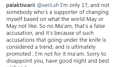पलक ने यूजर को रिप्लाई देते हुए लिखा, “मैं केवल 17 साल की हूं। दुनिया मुझे कैसे पसंद करती है या पसंद कर सकती है, इस बात पर मुझे विश्वास नहीं। मैम, आपके द्वारा लगाया गया आरोप गलत है। इस तरह के आरोप लगाना आजकल फैशन और ट्रेंड बन गया है। मैं इन सब चीजों के लिए नहीं बनी हूं मैम। आपको हताश करने के लिए माफी चाहूंगी, शुभरात्रि और ढेर सारी शुभकामनाएं।”