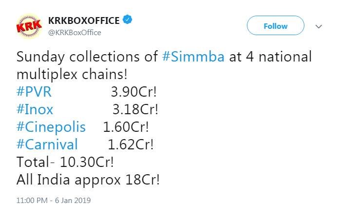 रणवीर सिंह की सिंबा भारत के 4 मल्टीप्लेक्स चेन में भी जबरदस्त कमाई कर रही है। फिल्म ने कुल चार मल्टीप्लेक्स में 18 करोड़ रुपए का बिजनेस किया है।