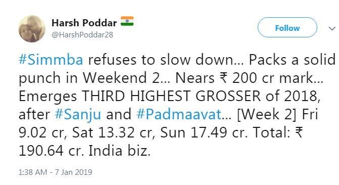 तरण ने एक ट्वीट में लिखा- ''सिंबा नीचे फिसलने का नाम नहीं ले रही है। फिल्म दूसरे वीकेंड में भी मजबूती के साथ टिकी हुई है। 200 करोड़ रुपए के बेहद नजदीक पहुंच गई है। सिंबा साल 2018 की तीसरी सबसे ज्यादा कमाई करने वाली फिल्म बन गई है। पहले नंबर पर संजू और दूसरे नंबर पर पद्मावत विराजमान है।''