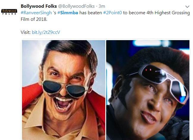 रणवीर सिंह की सिंबा बॉक्स ऑफिस पर जबरदस्त कमाई कर रही है। रणवीर की फिल्म ने अक्षय कुमार और रजनीकांत की 2.0 को कमाई के मामले में पछाड़ दिया है।