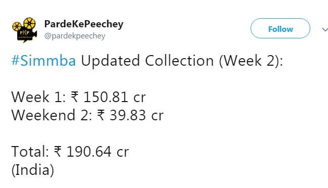 रणवीर सिंह की सिंबा ने पहले वीक में 76 करोड़ रुपए के आसपास की कमाई की है, जबकि दूसरे वीक में फिल्म ने 40 करोड़ रुपए की कमाई की है। इस हिसाब से फिल्म का कुल कलेक्शन 190 करोड़ रुपए से ज्यादा हो गया है।