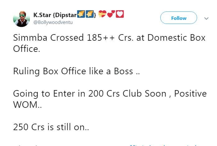 #Simmba is ruling the BO… Witnesses superb growth on second Sat… Expected to collect bigger numbers today… Will emerge Ranveer’s second highest grosser today, surpassing #BajiraoMastani… [Week 2] Fri 9.02 cr, Sat 13.32 cr. Total: ₹ 173.15 cr. India biz.