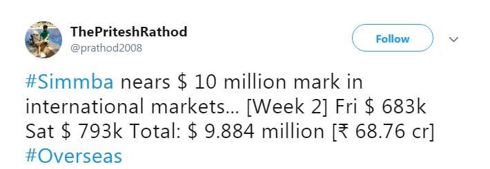 रणवीर सिंह की सिंबा भारत के अलावा विदेश में भी अच्छी कमाई कर रही है। फिल्म ने भारत में अबतक 173 करोड़ रुपए की कमाई कर ली है तो वहीं ओवरसीज मार्केट में फिल्म ने 68 करोड़ 76 लाख रुपए का कारोबार किया है।