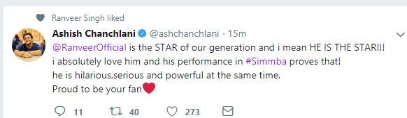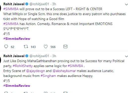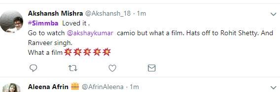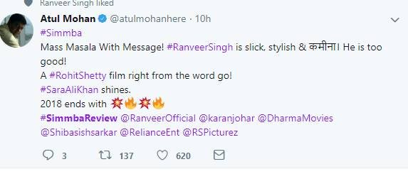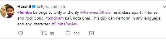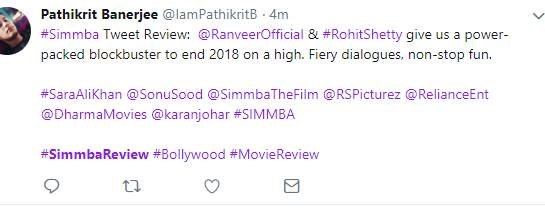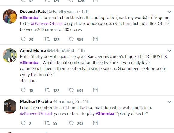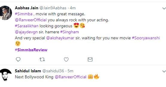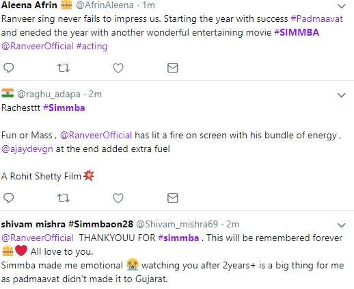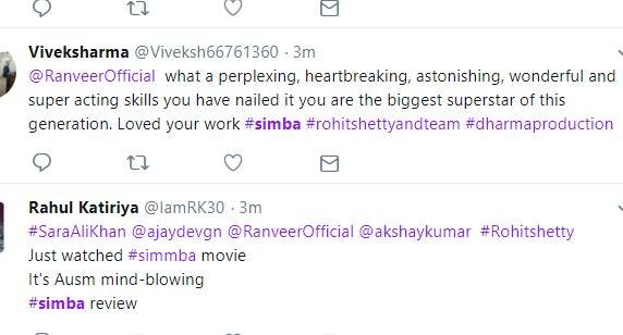सिंबा को देखने के बाद लोग अपनी प्रतिक्रिया दे रहे हैं। एक फैन ने कहा कि रणवीर सिंह अपने फैन्स को इंप्रेस करने में कभी पीछे नहीं रहते हैं। देखें बाकी लोगों के रिएक्शन्स...