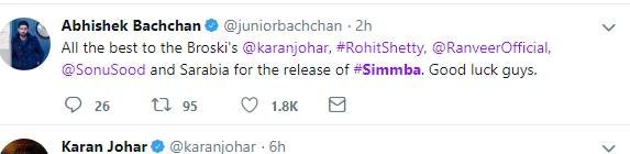 एक्टर लव सिन्हा ने भी फिल्म सिंबा को अपनी ढेरों शुभकामनाएं दी। लव ने सिंबा टीम को कहा बेस्ट विशेज सोनू सूद, रोहित शेट्टी और रणवीर सिंह।