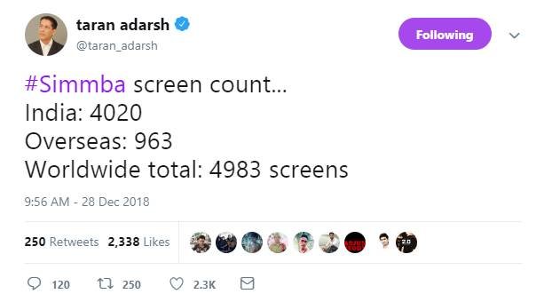देशभर में रणवीर सिंह और सारा अली खान की फिल्म सिंबा 4020 स्क्रीन्स पर रिलीज हुई है। ओवरसीस 963 और वर्ल्डवाइड फिल्म 4983 स्क्रीन्स पर जारी की गई है।