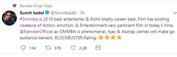 सुमित कंडेल के मुताबिक सिंबा साल की बेस्ट एंटरटेनर फिल्म है। फिल्म को ब्लॉकबस्टर कहते हुए उन्होंने रणवीर की फिल्म को 4 स्टार्स दिए हैं।