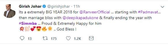 इधर गिरीश जौहर के मुताबिक, रणवीर के लिए ये साल बहुत अच्छा रहा है। शुरूआत 'पद्मावत' से, फिर रणवीर और दीपिका की शादी और अब साल के अंत में रणवीर की सिंबा।
