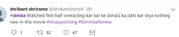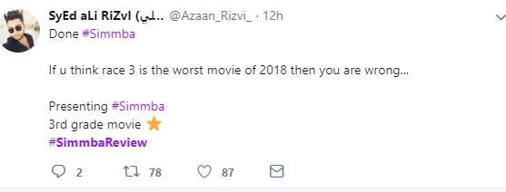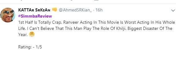 रणवीर के फैन्स जहां सिंबा को बेस्ट फिल्म बता रहे हैं, वहीं कुछ दर्शक फिल्म को नापसंद कर रहे हैं। एक फैन ने लिखा- रणवीर ने ओवर एक्टिंग कर-कर के दिमाग की दही कर दिया....