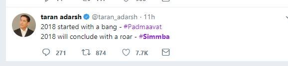 तरण आदर्श ने अपने ट्वीट के जरिए कहा कि रणवीर ने इस साल दो हिट दी हैं, पहली 'पद्मावत' और दूसरी 'सिंबा'