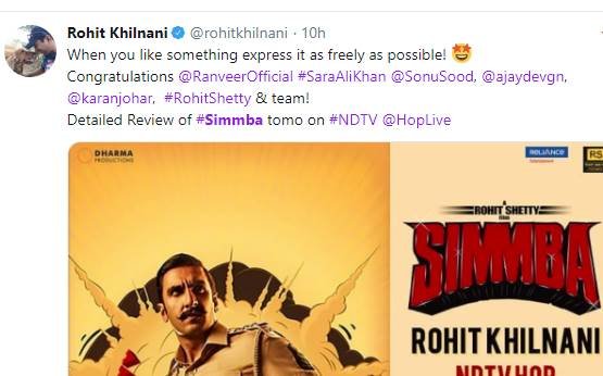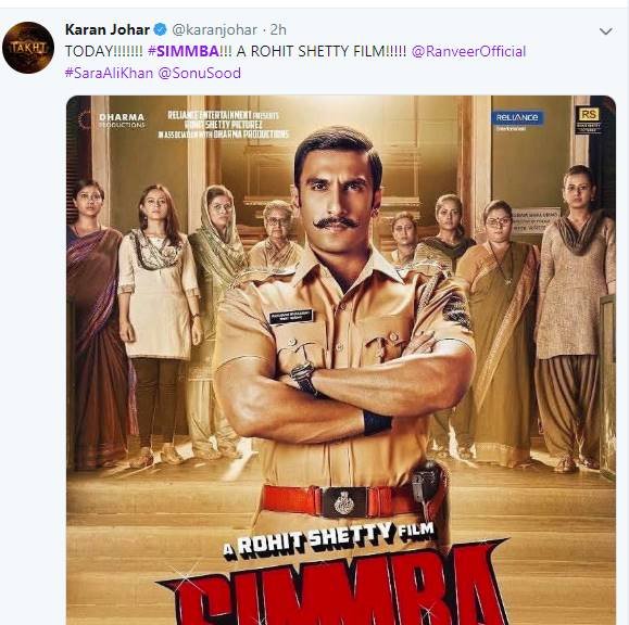 करण जौहर ने भी रणवीर सिंह की फिल्म 'सिंबा' को लेकर ट्वीट किया है। बता दें, करण जौहर ने इस फिल्म को प्रोड्यूस किया है।